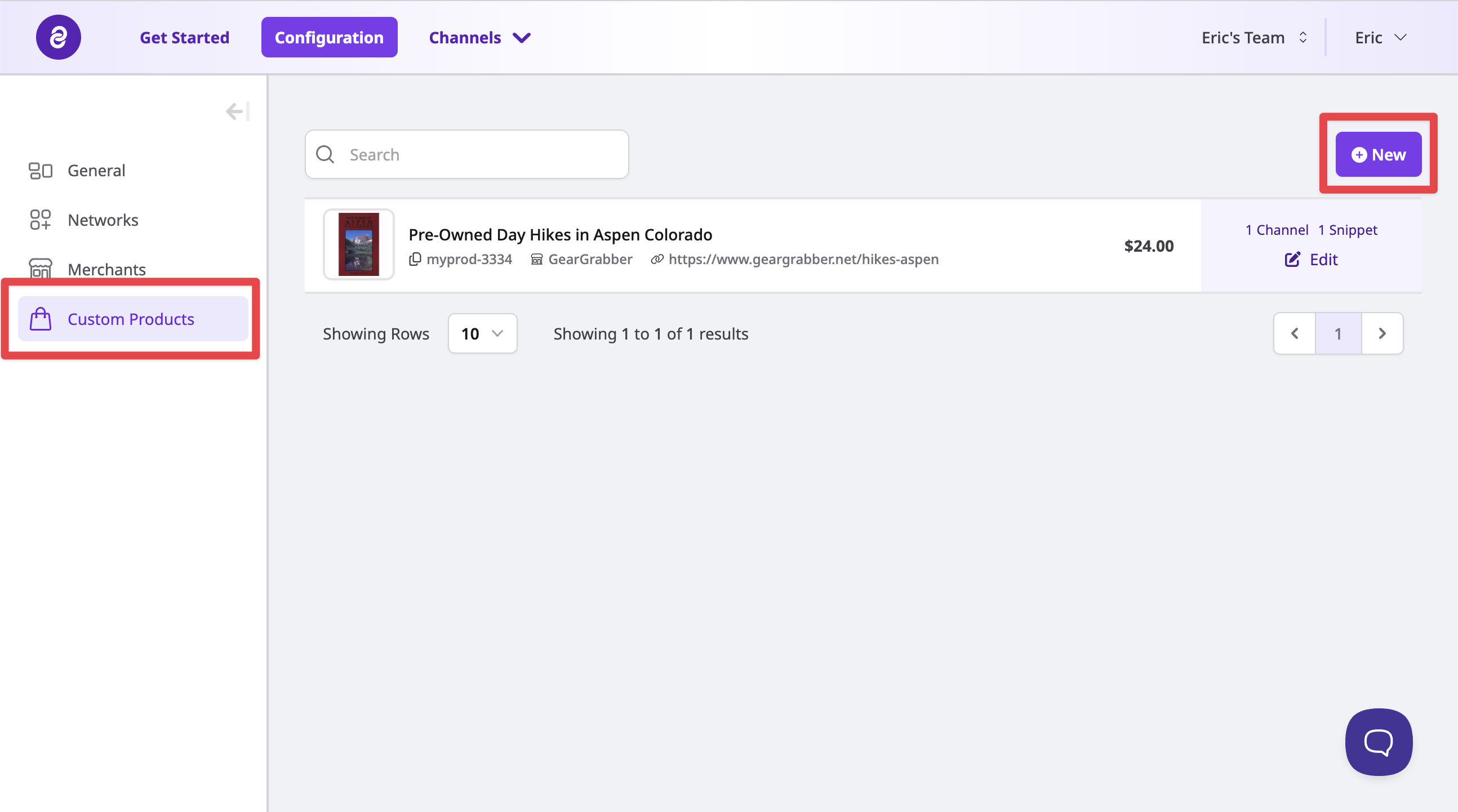 From here, you'll be able to see and search all of your existing Custom Products. Just click the product to add to your Snippet.